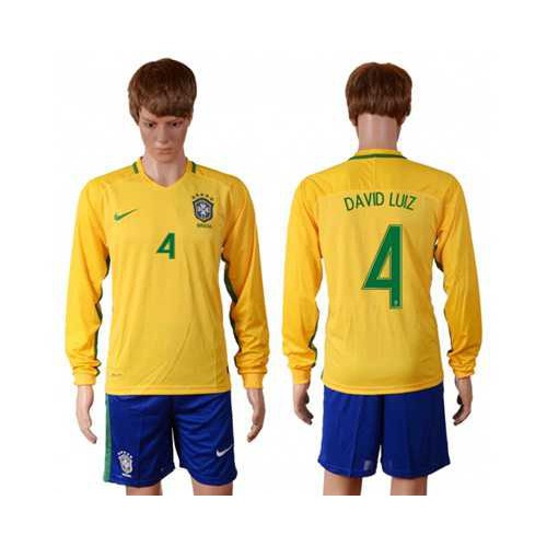 Brazil #4 David Luiz Home Long Sleeves Soccer Country Jersey