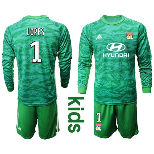 • Lyon #1 Lopes Green Goalkeeper Long Sleeves Kid Soccer Club Jersey