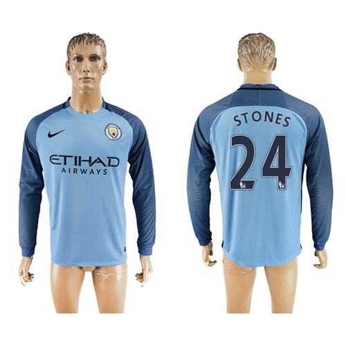 Manchester City #24 Stones Home Long Sleeves Soccer Club Jersey