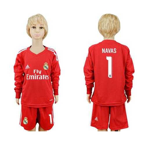 Real Madrid #1 Navas Red Goalkeeper Long Sleeves Kid Soccer Club Jersey